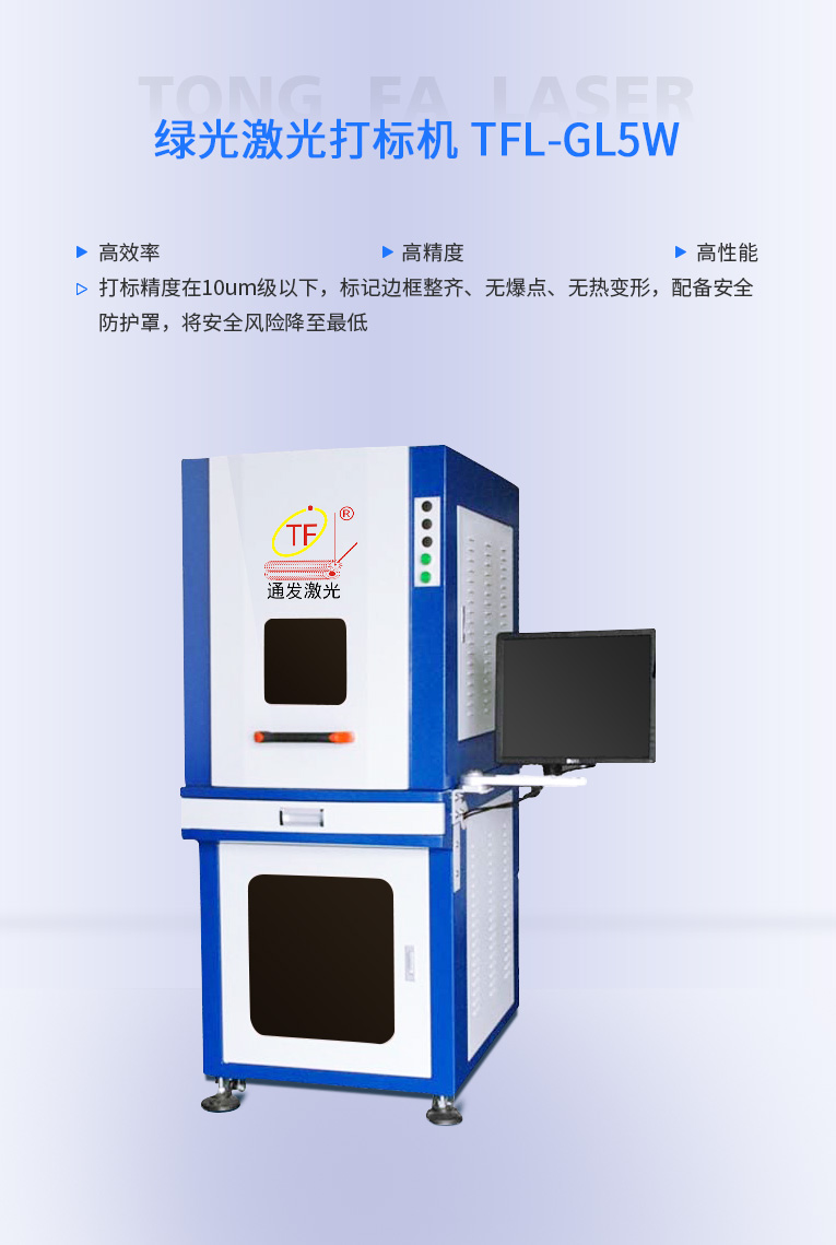 通發(fā)激光研發(fā)的TFL-GL3W/5W 綠光激光打標(biāo)機(jī)配備安全防護(hù)罩,避免設(shè)備操作員誤操作引起的人身傷害,將安全風(fēng)險(xiǎn)降至最低,產(chǎn)品遠(yuǎn)銷海內(nèi)外.打標(biāo)精度在10μm級以下,標(biāo)記邊框整齊、無爆點(diǎn)、無熱變形,有效提高加工的成品合格率,使用壽命長、配合全封密光路、特別加固的光路底座滿足長期、穩(wěn)定性的工作需要。